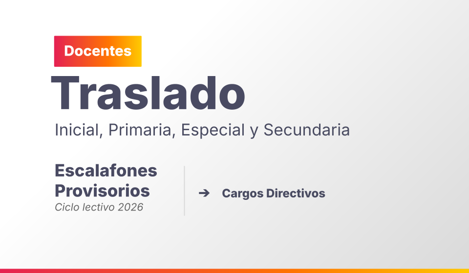 Se comunica que desde el 03/11/2025 al 07/11/2025, se exhibirán los escalafones provisorios de Traslado para Cargos Directivos, correspondientes a Inicial, Primario, Especial y Secundaria, a los efectos de la formulación de impugnaciones a que hubiere lugar, conforme Art. 8 – Anexo IV – Decreto Nº 3029/12.